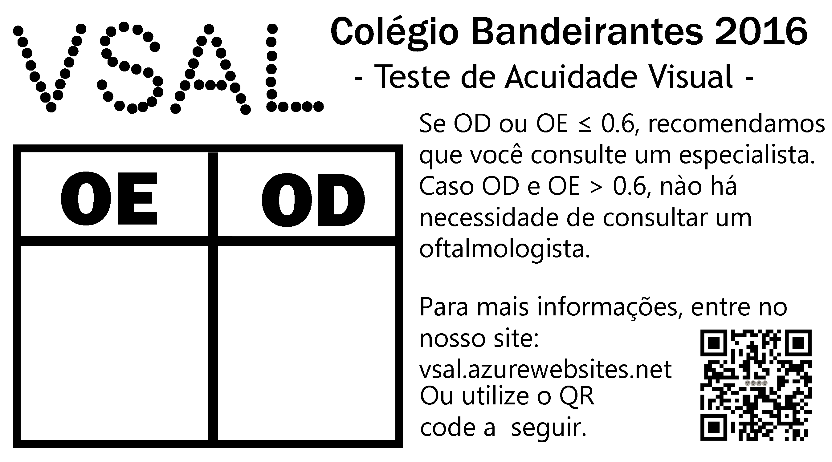 O nosso projeto consiste na criação de um processo de triagem mais acessível e prático, que utiliza uma placa de automóvel ou uma letra montada de fita isolante ao invés da Tabela de Snellen e a tampa de saleiro em substituição ao óculos estenopeicos com o objetivo de acelerar e expandir esse tipo de atendimento.